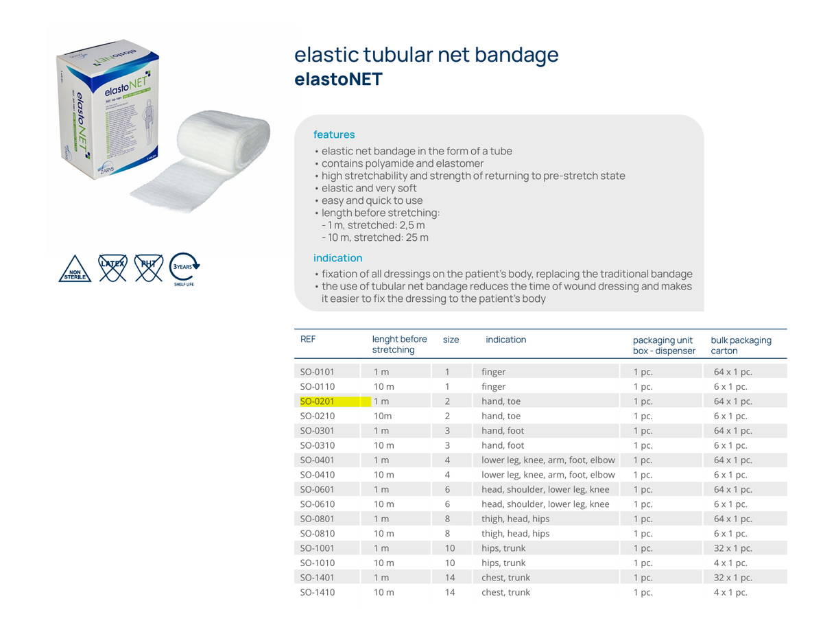 彈性固定網、管狀彈性繃帶、手指腳趾包紮、SO-0201、elastoNET、敷料固定網、歐洲製傷口固定、非無菌網套、傷口包紮繃帶、創傷護理、彈性繃網、醫療固定用具