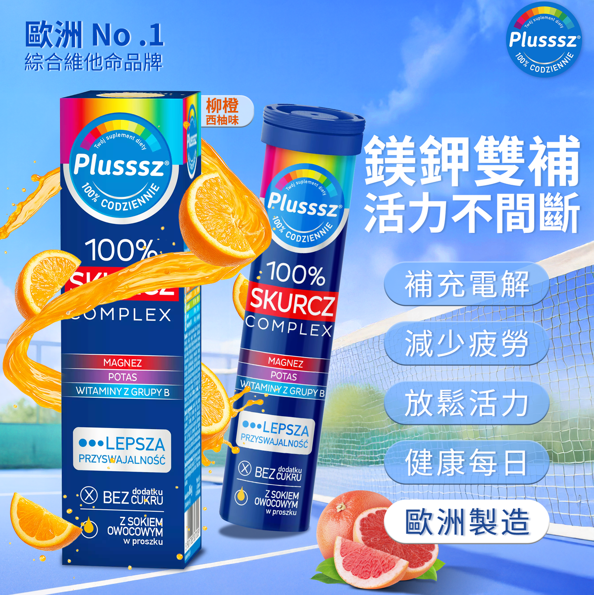 普乐适, Plusssz, 抗抽筋, 补镁, 补钾, 水溶片, 泡腾片, 维他命B群, 辅酶Q10, 夜间抽筋, 肌肉痉挛, 眼皮跳, 运动补给, 体力恢復, 无糖配方, 柳橙西柚味, 波兰製造, made in Europe, magnesium supplement, anti-cramps complex, electrolyte balance, muscle recovery