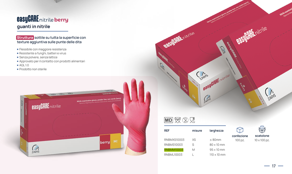 ZARYS easyCARE nitrile berry 是一款粉紅色設計的中碼丁腈檢查手套,專為醫療與專業清潔使用設計。無粉無乳膠,抗敏設計,具有良好延展性與穿戴手感。手指具紋理,操作時更穩定安心,並通過食品接觸與 AQL 1.0 嚴格檢測。由歐洲工廠製造,品質穩定可靠。